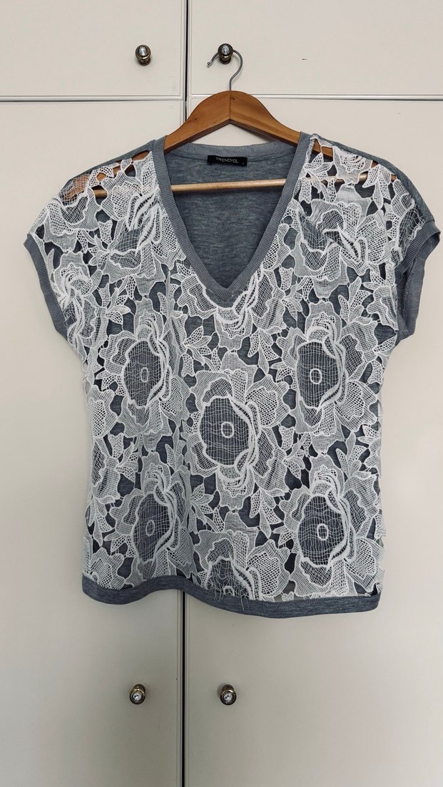 V yaka, kısa kollu, gri renkte, dantel çiçek desenli bol kesim bluz. Günlük şıklık için ideal, sadece sağ omza yakın kesimde iplikler biraz gevşemiş. Çok az kullanıldı.