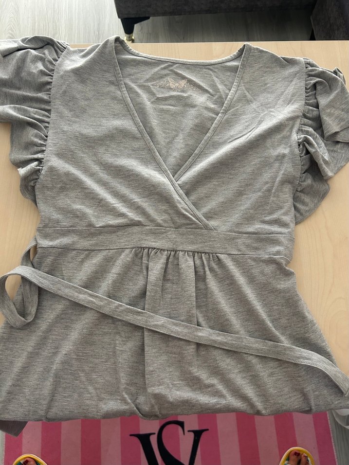 Gri renkte, V yakalı, kısa kollu ve beli kuşaklı, midi boyda, vücuda oturan elbise