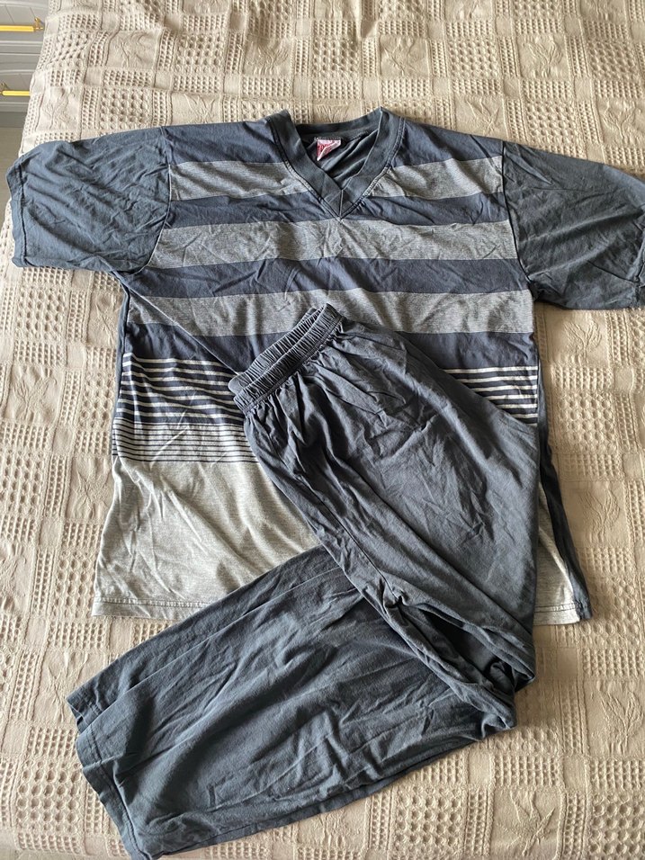 Erkek pijama takımı, bol kesim, V yaka ve kısa kolludur. Gri üstte ince yatay çizgiler, alt ise düz gri uzun boydadır. Rahat ve şık bir görünüm sunar.
