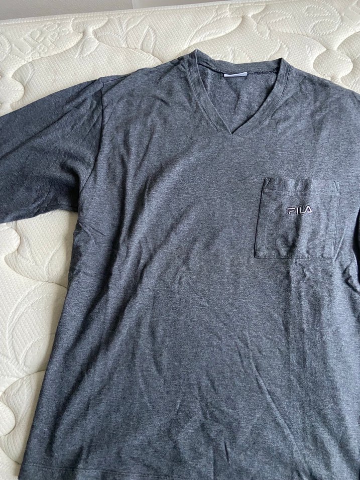 Gri renkte, V yakalı ve kısa kollu erkek pijama üstü. Rahat kesim ve göğüs cebinde FILA işlemeli detay ile sade ve şık.