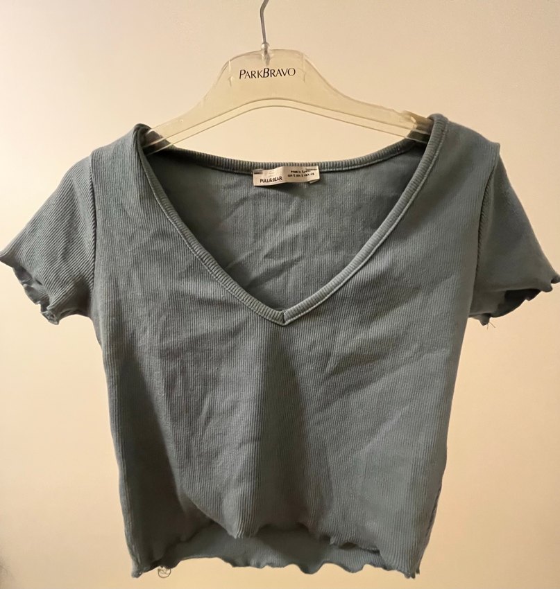 Yumuşak keten kumaştan yapılmış, V yaka ve kısa kollu, vücuda oturan kadın tişörtü. Baskılı deseni ve rahat sokak stili görünümü sunar. Marka: pull and bear. Dar kalıp hiç giyilmedi