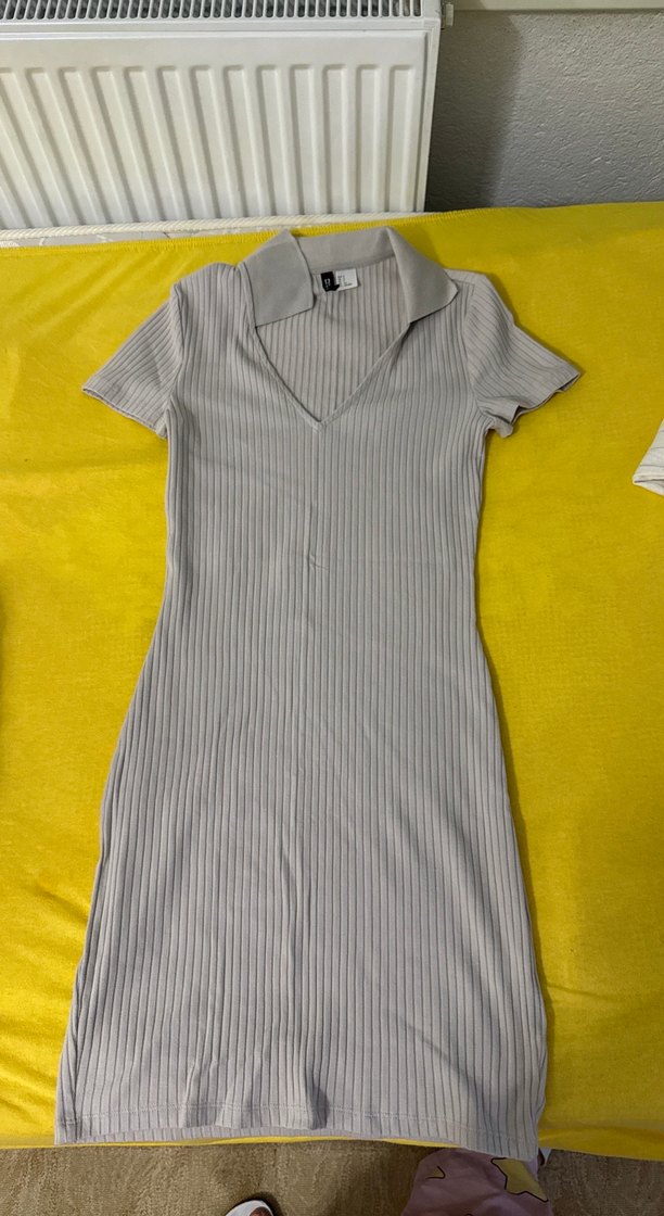 Gri renkte, kısa kollu ve V yaka detaylı, pilili dokulu sentetik kumaştan yapılmış dar kesim midi elbise. Günlük sokak tarzı için uygundur.