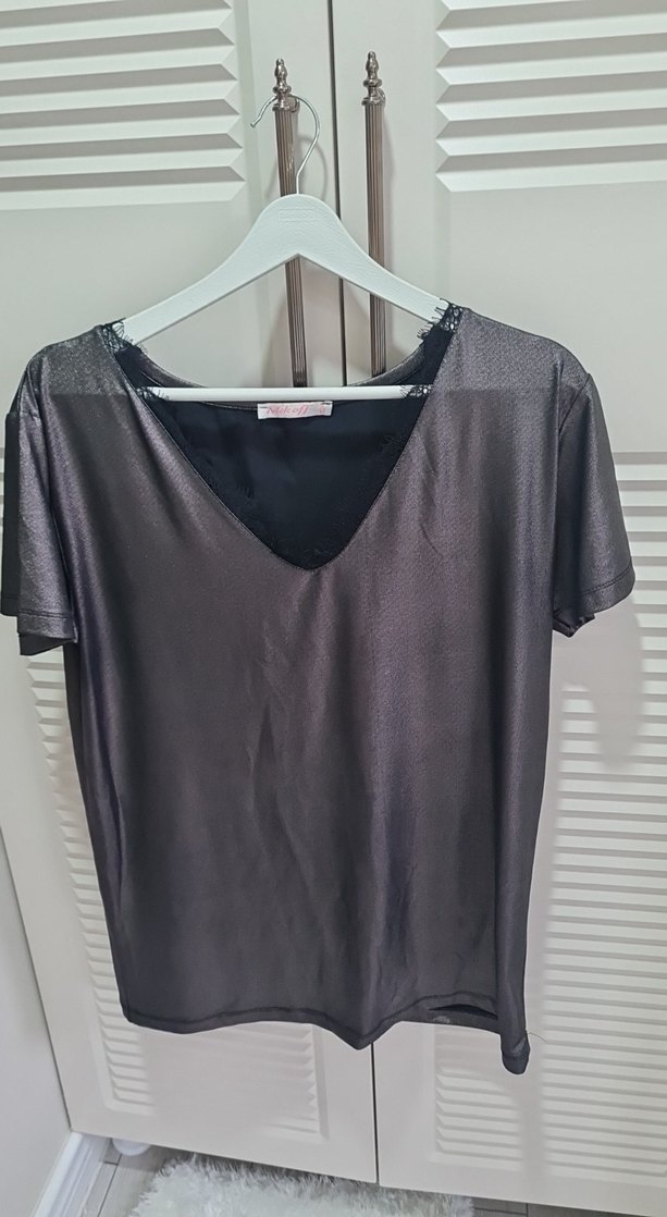 Gri renkte, V yaka ve kısa kollu, salaş kesim midi boy bluz. İpeksi kumaştan üretilmiş, rahat ve şık bir görünüm sunar, günlük kullanıma uygundur. ️