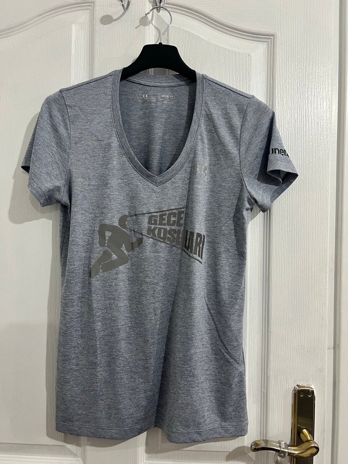Gri renkte, V yakalı ve kısa kollu, baskılı kadın spor tişörtü. Sentetik kumaştan. Spor ve sokak stiline uygundur.