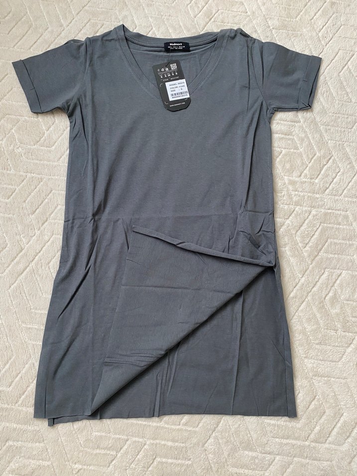Gri renkli, V yakalı ve kısa kollu , rahat kalıp ve normal midi boyda, yumuşak sentetik kumaştan üretilmiştir.