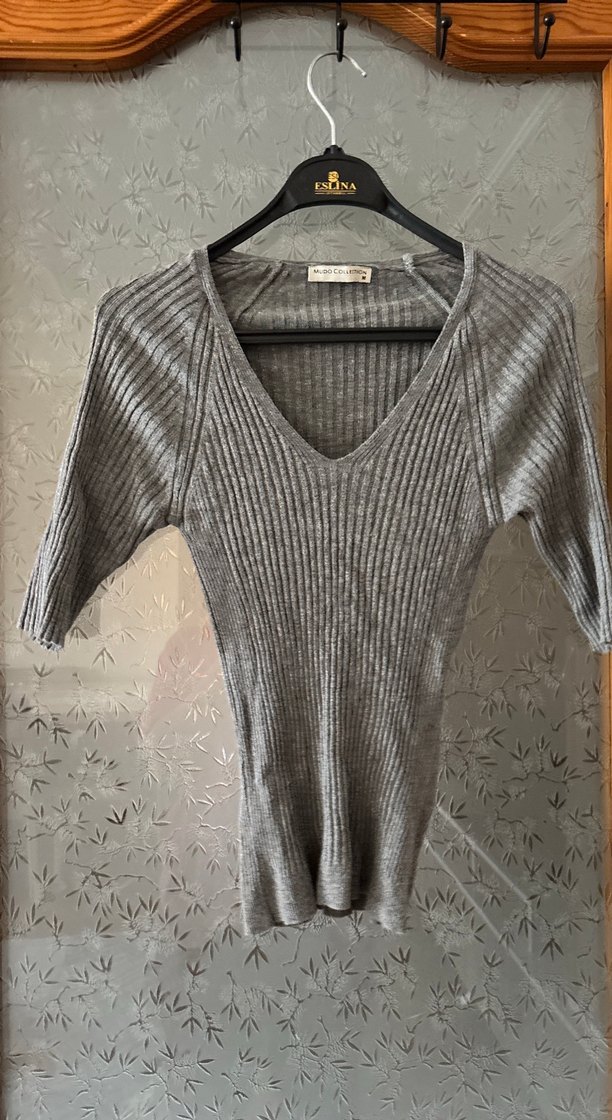 V yaka, kısa kollu, gri renkli, yumuşak triko kumaştan yapılmış, normal midi boyda, sade tasarımlı, fitted kadın kazak.