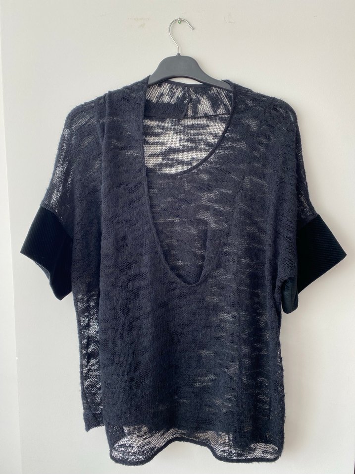 Gri keten kumaştan, derin V yakalı ve kısa kollu, bol kesim triko kazak. Örgü dokusu rahat bir his sunar, günlük kullanıma uygundur ve gotik tarzı yansıtır.