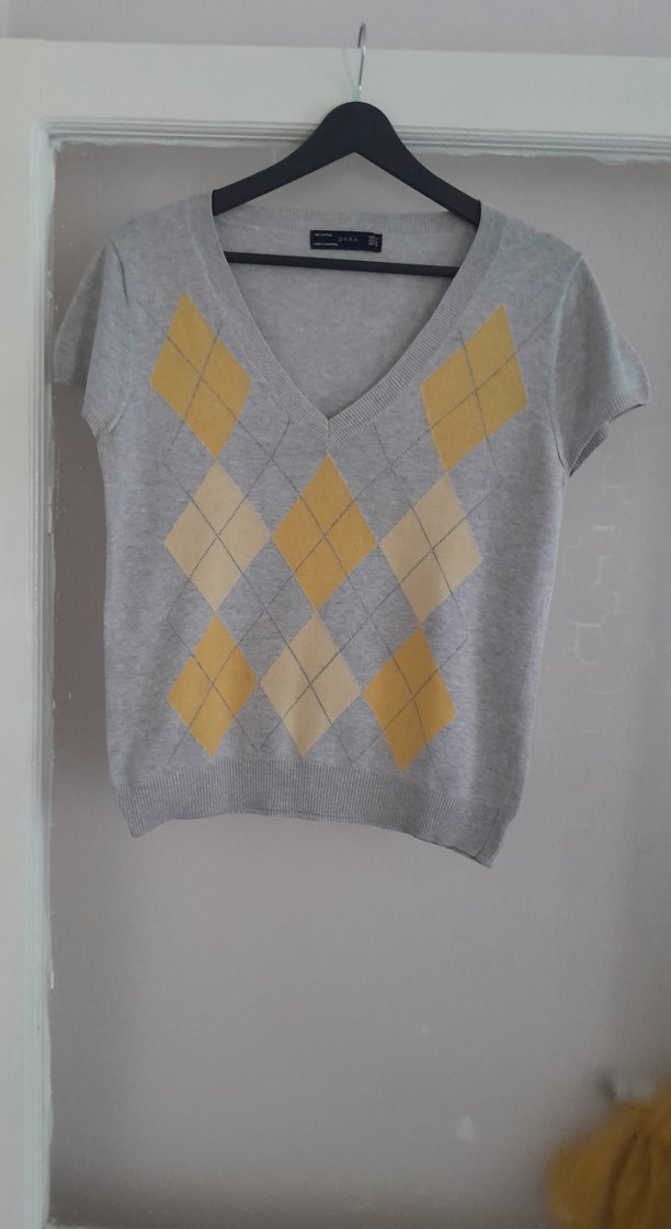 Gri renkli, V yaka ve kısa kollu triko kazak. Rahat kesim ve normal boyda, hafif argyle desenlidir. Günlük kullanıma uygun.m l bedene uygun
