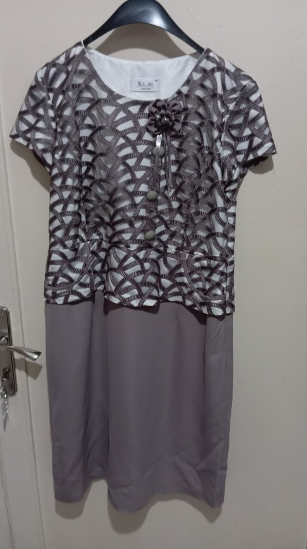Gri renkte, V yakalı ve kısa kollu, pileli ve batik desenli üst kısmı ile düz uzun etekli, çağdaş ve rahat kesim ofis elbisesi, 1 defa kullanıldı 48 beden uyumlu.