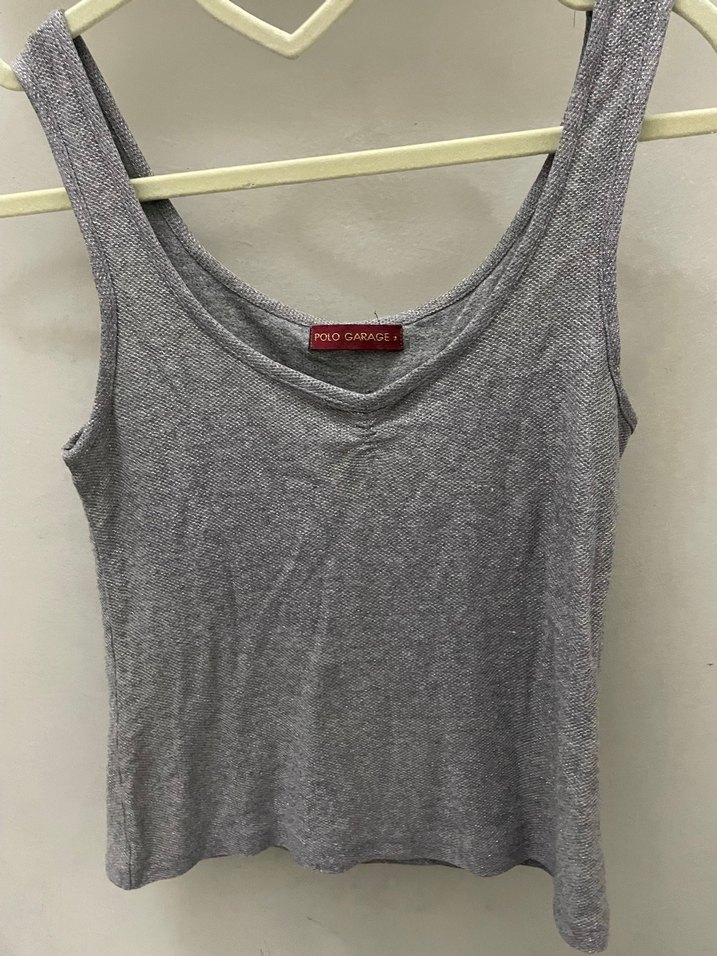 Gri renkli, yumuşak keten kumaştan yapılmış, V yaka ve kolsuz, normal boyda, salaş kesim kadın atlet. Dış mekan ve günlük kullanıma uygundur.