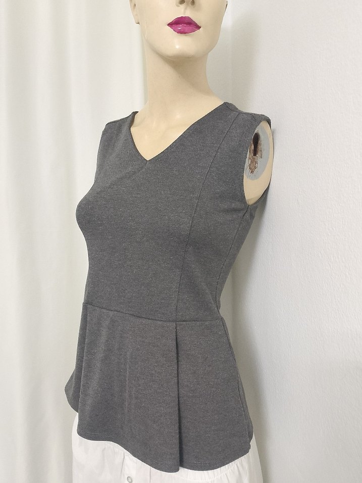 Gri renk, V yakalı ve kolsuz, yumuşak sentetik kumaştan yapılmış, normal boy midi kesim, modern ve rahat kadın triko buluz