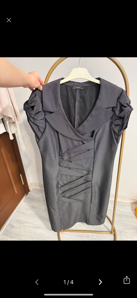 Gri renkte, V yakalı ve kolsuz mini elbise. Omuzlarda fırfır detayları ve baskılı deseni vardır. Ofis ve iş ortamları için uygundur.
