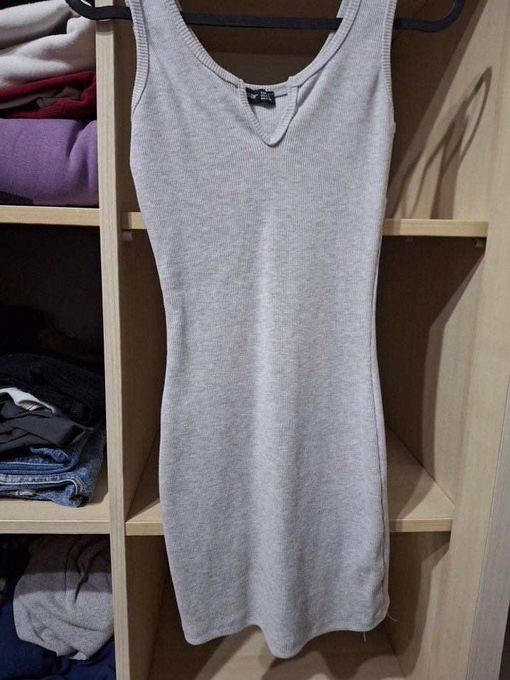 Gri renkte, V yakalı ve kolsuz, vücuda oturan mini elbise. Rahat sentetik kumaştan, gündelik sokak stili için uygun. Fitil detaylıdır. Birkaç kez giyindim.