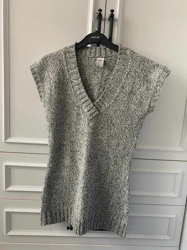 Gri renkte, V yaka ve kolsuz örgü kadın süveter. Rahat kesimi ve yumuşak dokusuyla günlük ve sokak stiline uygun. xs ve s bedene uygun normalde 12 yaş
