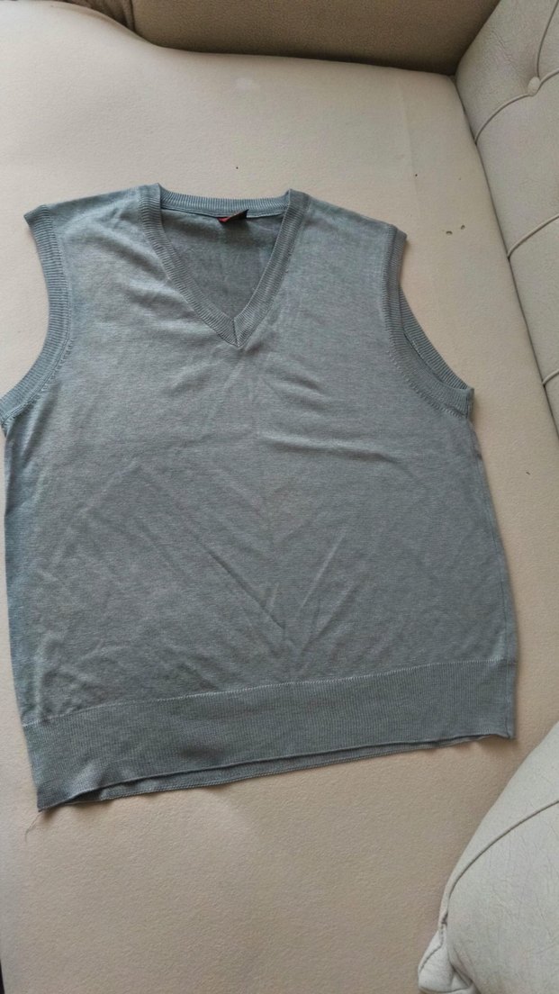 Gri renkli, V yakalı ve kolsuz kadın süveter. Nefes alabilen keten kumaştan yapılmış, rahat ve salaş kesimiyle günlük kullanım için uygundur.