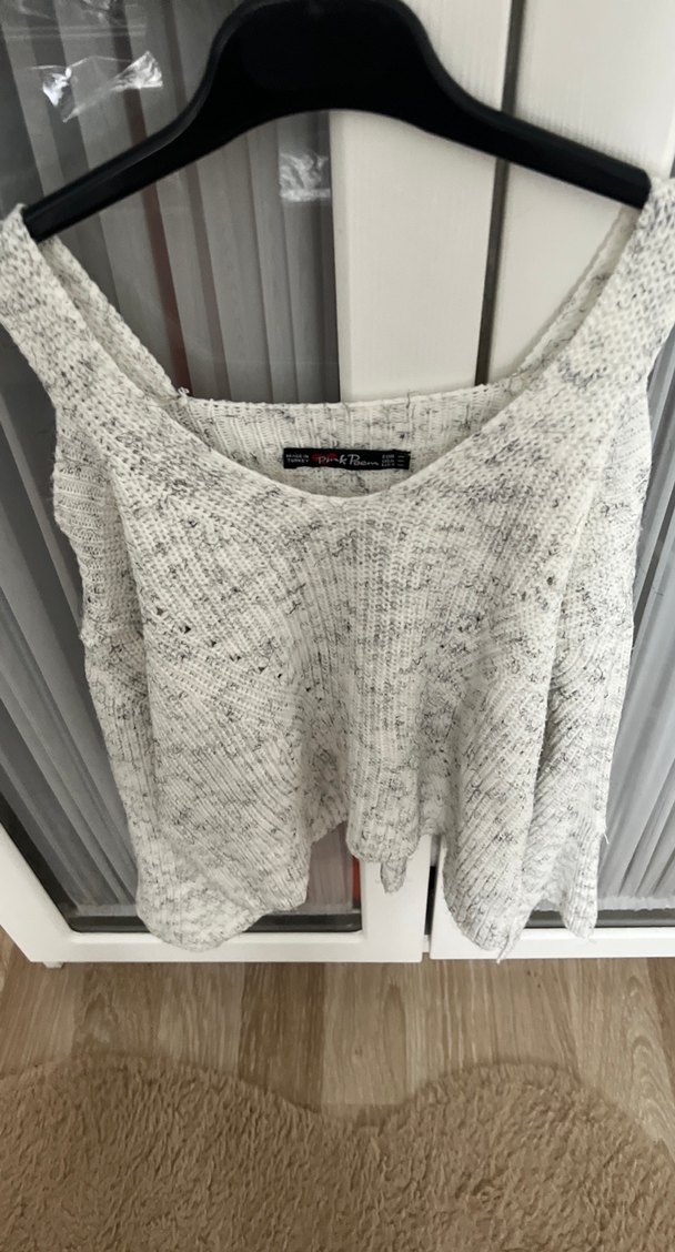 Gri renkte, V yakalı, kolsuz ve kısa kesim triko süveter. Rahat ve bol kesimiyle günlük sokak stiline uygundur.