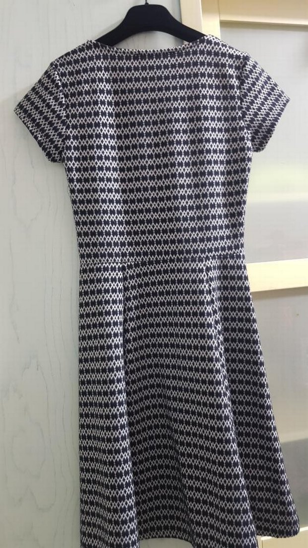 V yaka, kısa kollu, pilili ve desenli gri midi elbise, ofis kullanımı için uygun, güncel tarzda.
