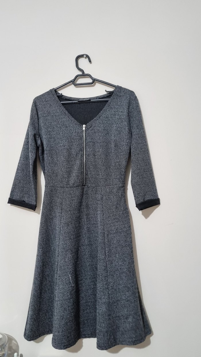 Gri tonlarda, V yakalı ve önden fermuarlı, uzun kollu midi boy dar kesim elbise. Ofis ve günlük kullanım için uygun minimal tasarım.