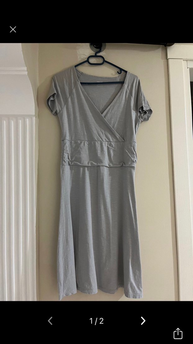 Gri renkli, V yakalı ve drapeli elbise . Kısa kollu, rahat kesim ve midi boyda, yumuşak keten kumaştan üretilmiştir.