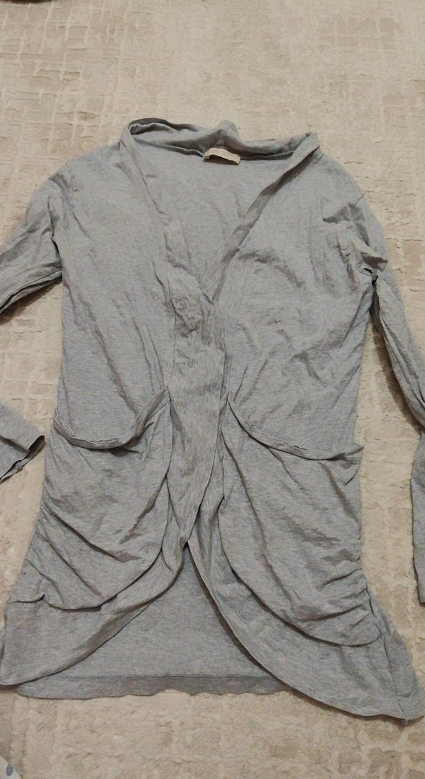 Yumuşak keten kumaştan, uzun kollu, bol kesim gri hırka. V yaka ve midi boyda, günlük rahat kullanım için uygun.