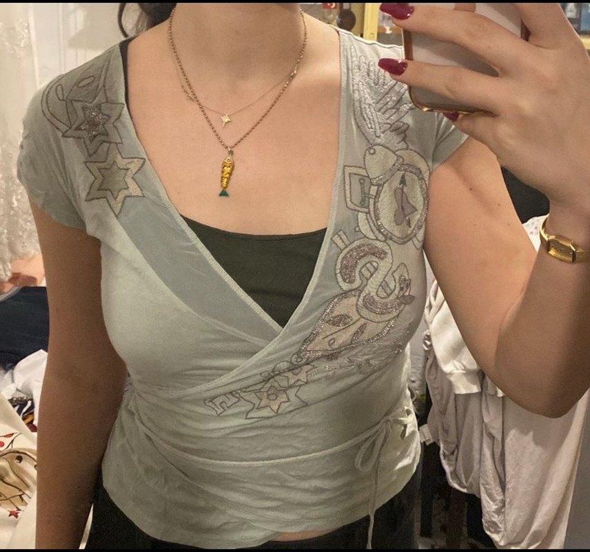 Gri renkli, V yaka ve kısa kollu, nakışlı bohem desenlere sahip, ince ve ipeksi kumaştan yapılmış, drapeli ve normal midi uzunlukta bluz