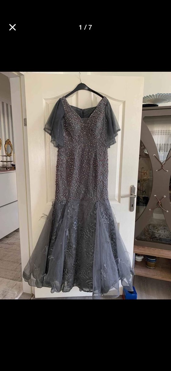 Gri V Yaka Nakışlı Uzun Abiye Elbise