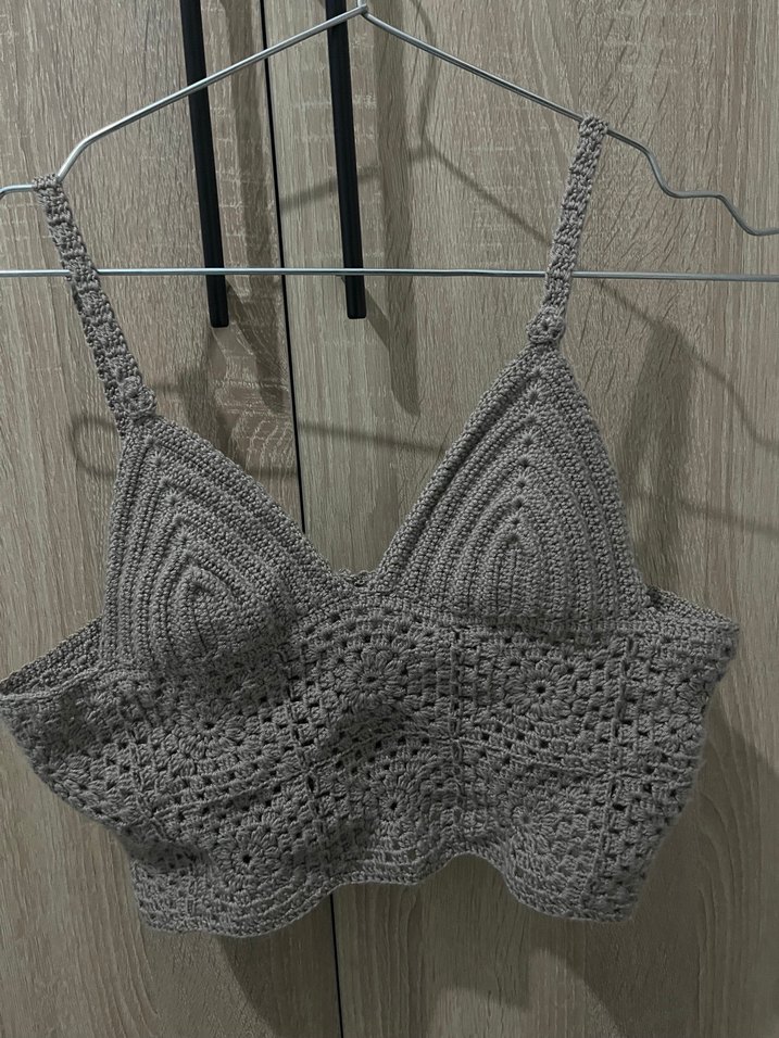 Gri renkte, V yakalı ve askılı örgü büstiyer. Bol kesim ve kısa boy, bohem tarzı için uygun. El emeği üründür hiç giyilmedi s m uyumlu küçük göğüsler için ideal