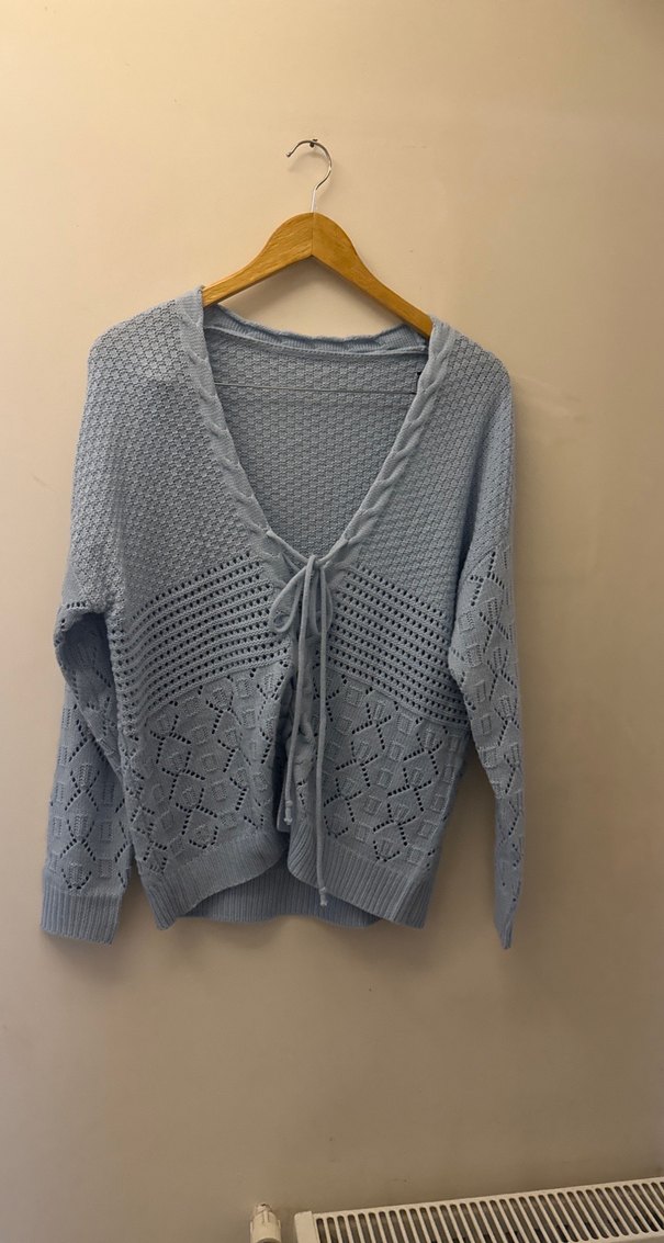 Gri renkli, V yaka ve uzun kollu örgü kadın hırka. Rahat, kısa kesim ve bohem tarzda, ön bağcıklı detaylarıyla günlük kullanıma uygun.