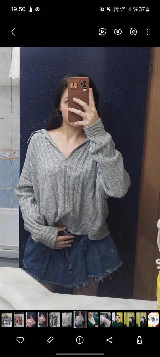 Gri renkli, uzun kollu, V yaka örgü kadın kazak. Denim kumaştan, bol kesim ve midi boyda, günlük rahat sokak stili için uygundur.