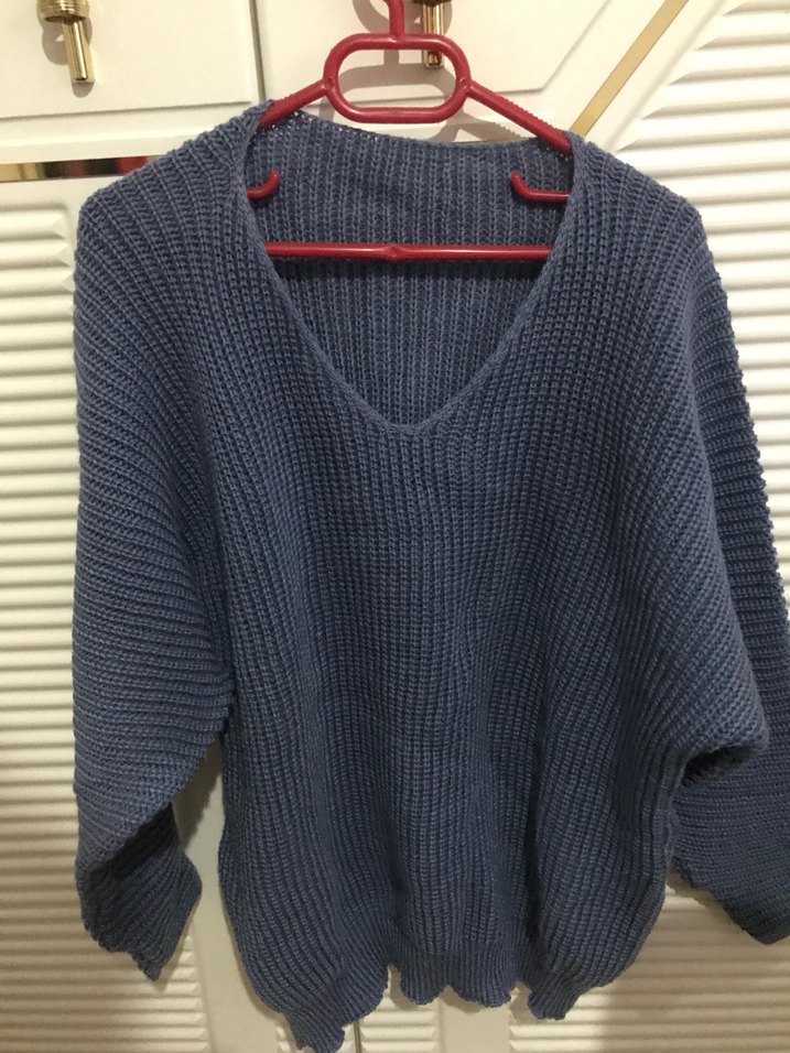 Gri renkli, V yaka ve uzun kollu örgü kadın kazak. Rahat kesimi ve midi boyuyla günlük kullanıma uygundur. Mavi gri karışık bir rengi var