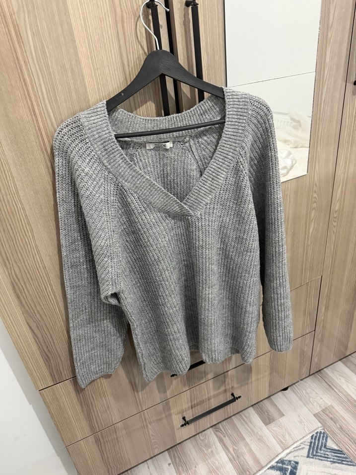 Gri örgü kadın kazak, bol kesim, uzun kollu ve V yaka detaylıdır. Rahat ve gündelik normcore tarzda kullanıma uygundur.