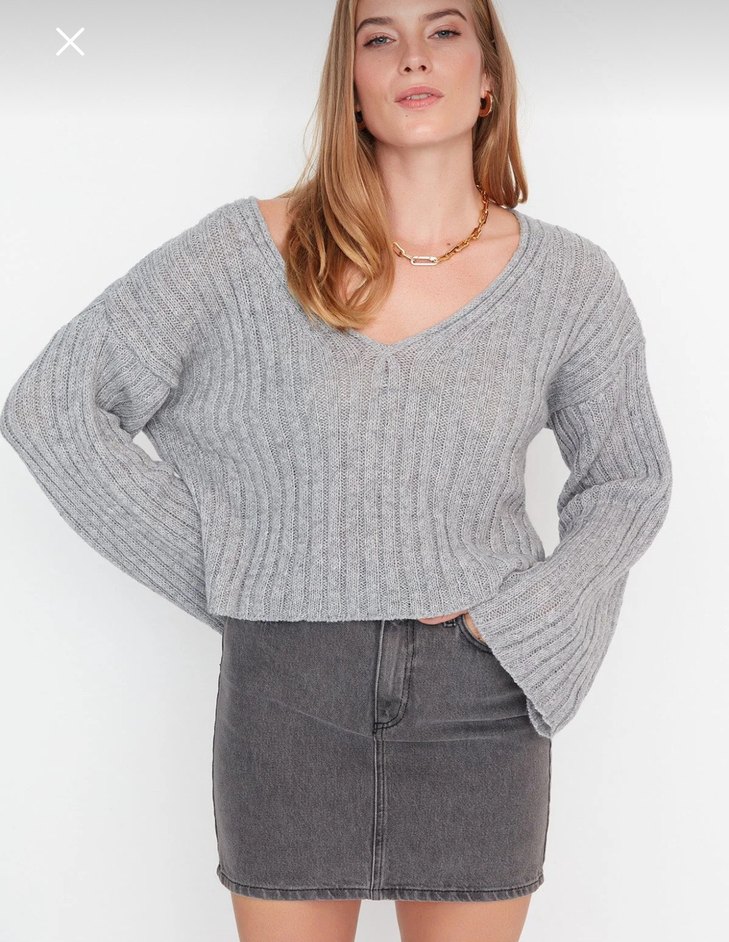 Gri renkte, V yakalı ve uzun kollu örgü kazak, rahat ve bol kesimdir. Midi boy ve desensiz tasarımıyla günlük kullanıma uygundur.
