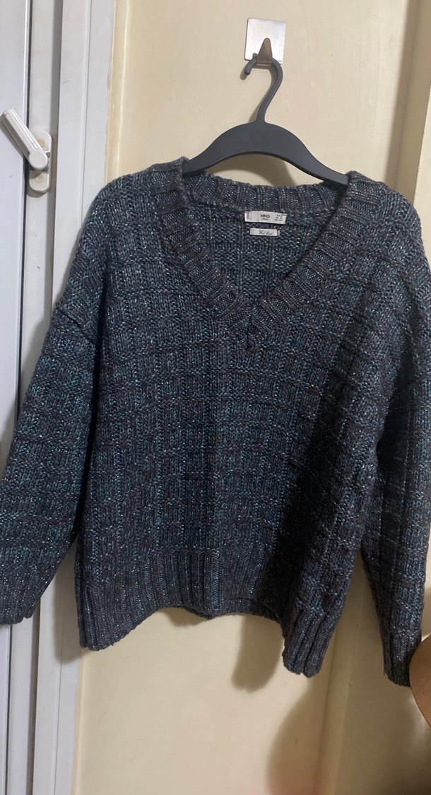 Gri renkli, V yakalı, uzun kollu, normal midi boyda örgü kadın kazak. Rahat kesimi ve desensiz tasarımıyla günlük kullanıma uygundur.