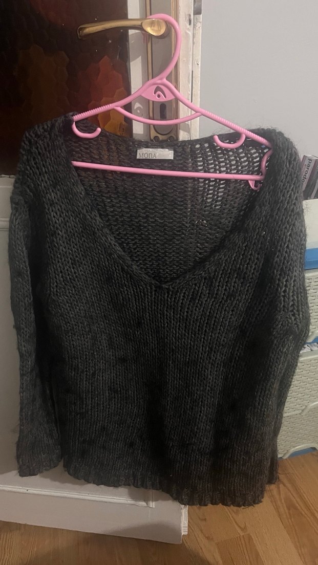 Gri renkli, V yaka ve uzun kollu örgü kazak, rahat kesimiyle günlük kullanıma uygundur. M l xl olur