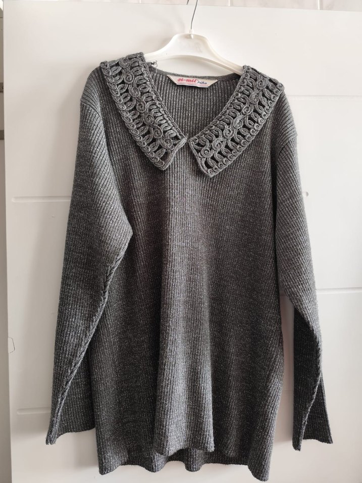 Gri renkli, V yaka ve detaylı örme yakaya sahip kadın kazak. Uzun kollu, bol ve normal boyda, rahat günlük kullanım için uygun.
