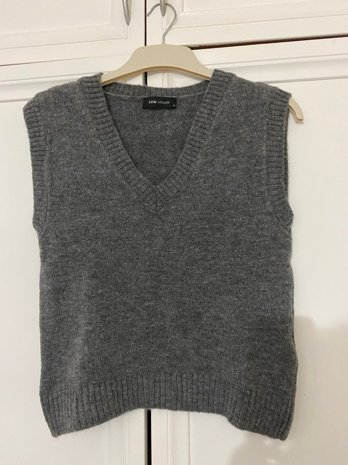 Gri renkli, yumuşak yün kumaştan örülmüş, V yakalı ve kolsuz, rahat kesimli kadın süveter. Günlük kullanıma uygun, sokak stiline uyum sağlar.