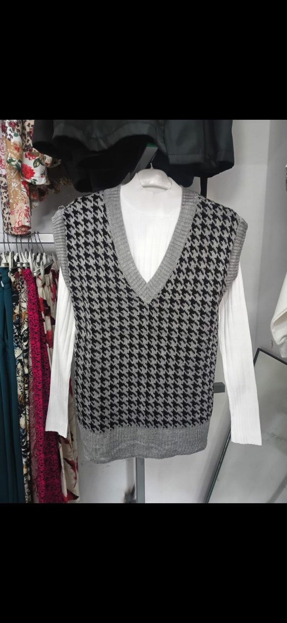 Gri renk, V yaka, örgü kadın süveter. Salaş kesimi ve kolsuz tasarımıyla rahat ve günlük kullanıma uygun.