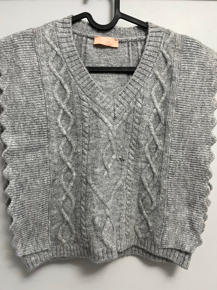 Gri renkli, V yaka ve kolsuz örgü kadın süveter, rahat bir kesime sahiptir. Günlük kullanım için uygun, desensiz ve konforlu bir üründür. Küçük bir defosu mevcut son fotoğrafta gösterilmiştir.