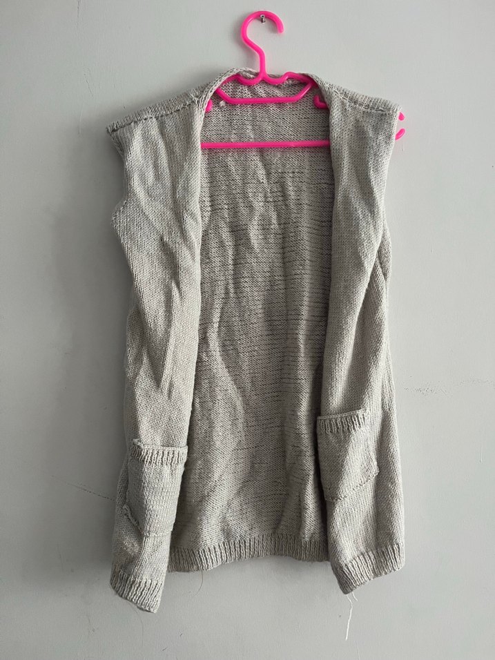 Gri renkli, V yaka ve bol kesim örgü kadın süveter. Kolsuz ve normal midi boydadır, rahat günlük kullanıma uygundur.