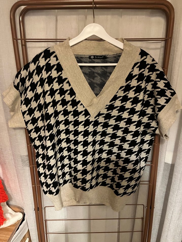 Gri renkli, vintage desenli, V yaka ve kısa kollu, bol kesim örgü kadın süveter. Günlük sokak stili için uygundur.