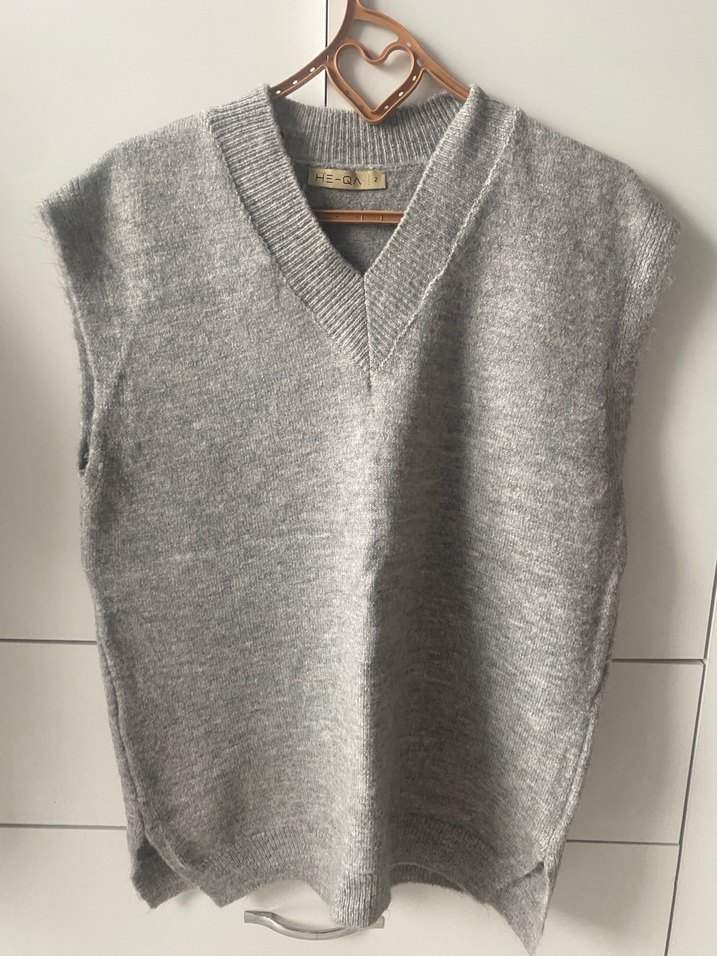 Gri, örgü yün kumaştan, V yaka ve kolsuz, rahat kesim normal midi uzunluğunda kadın süveter. Günlük kullanıma uygun, konforlu bir tasarım.
