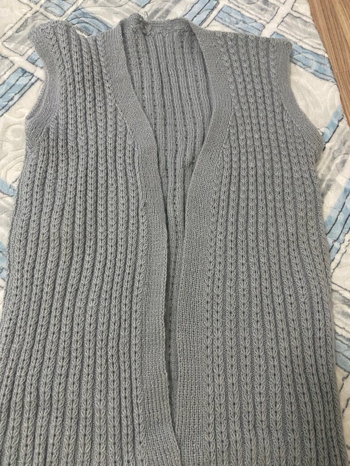 Gri renkli, örgü kumaştan yapılmış, V yakalı ve kolsuz kadın yeleği. Normal boyda ve vücuda oturan kesime sahip, rahat kullanıma uygun.