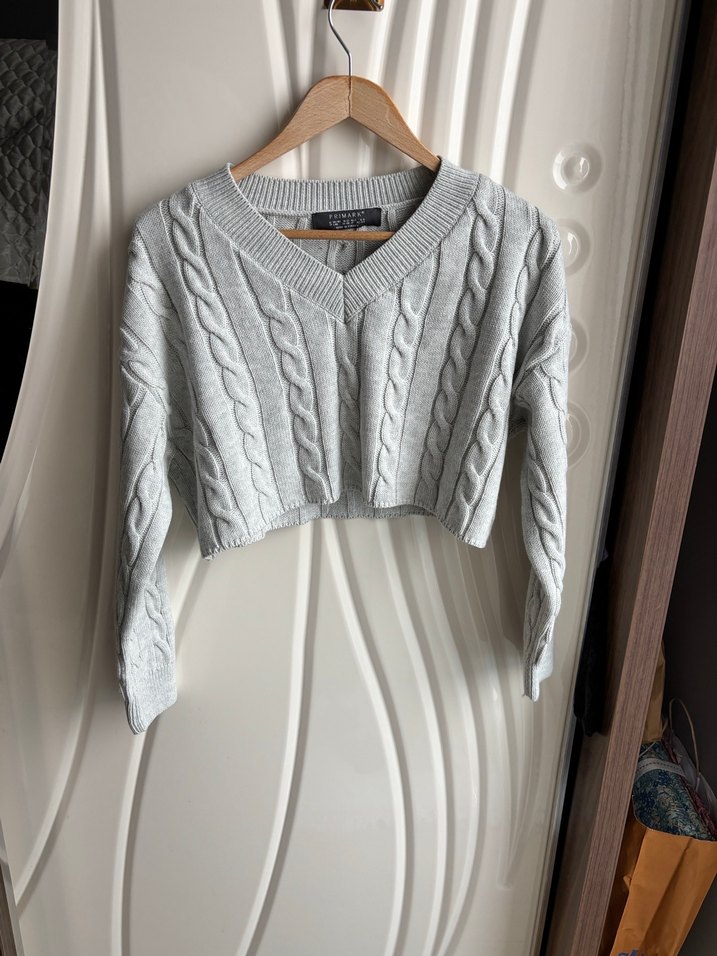 Gri renkli, V yakalı ve uzun kollu örgü mini kazak. Rahat, kısa kesimi ve sıcak dokusuyla günlük sokak stiline uygundur.