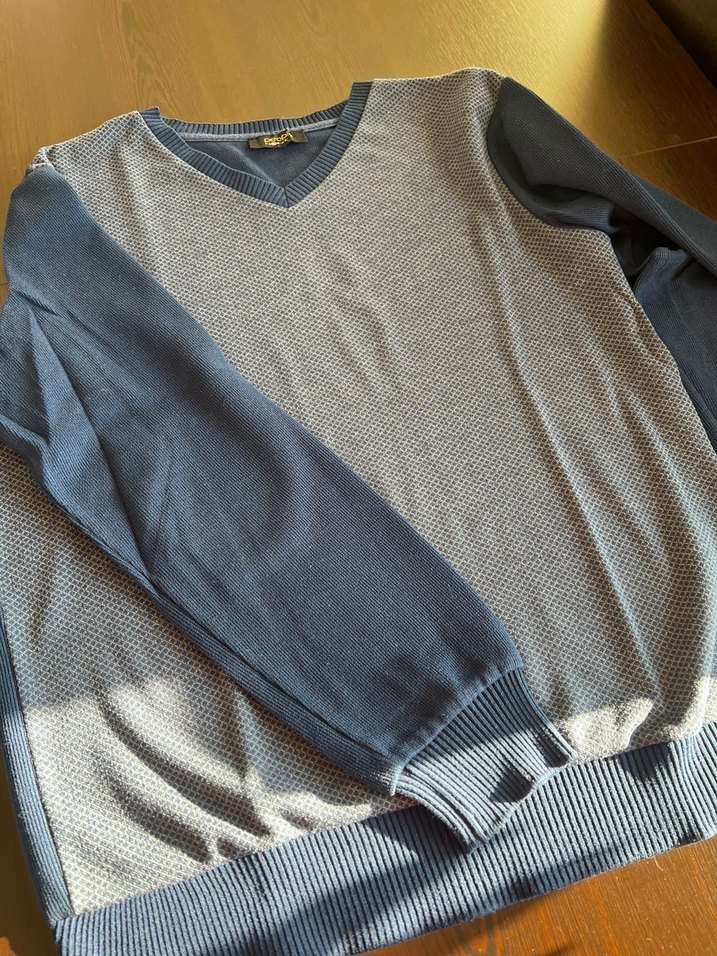 Pamuklu, gri tonlarda, V yaka ve uzun kollu, rahat kesim erkek kazak. Fabrika 40 bedendir