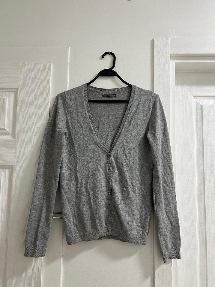 Pamuklu kumaştan, uzun kollu ve V yakalı, gri renkli, rahat kesim kadın hırka. Minimalist tasarımı günlük kullanım için uygundur.