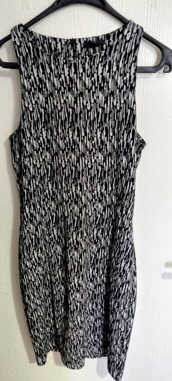 Kolsuz, v yaka ve pilili desenli uzun triko elbise. Gri renkte, modern ve minimal bir tarza sahiptir.