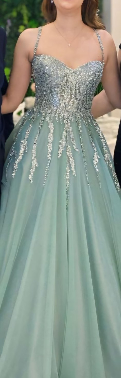V yaka, kolsuz, simli ve nakışlı detaylara sahip açık yeşil uzun ve vücuda oturan nişan elbisesi. Modern klasik tarzda şık bir seçim. ✨