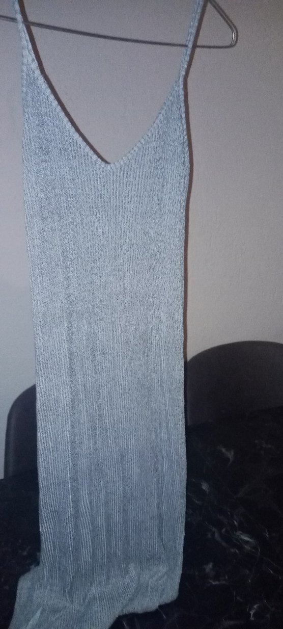 Gri renkte, yumuşak sentetik kumaştan, uzun ve v yaka, kolsuz, vücuda oturan triko elbise. Rahat ve bohem tarzda günlük kullanım için uygundur.