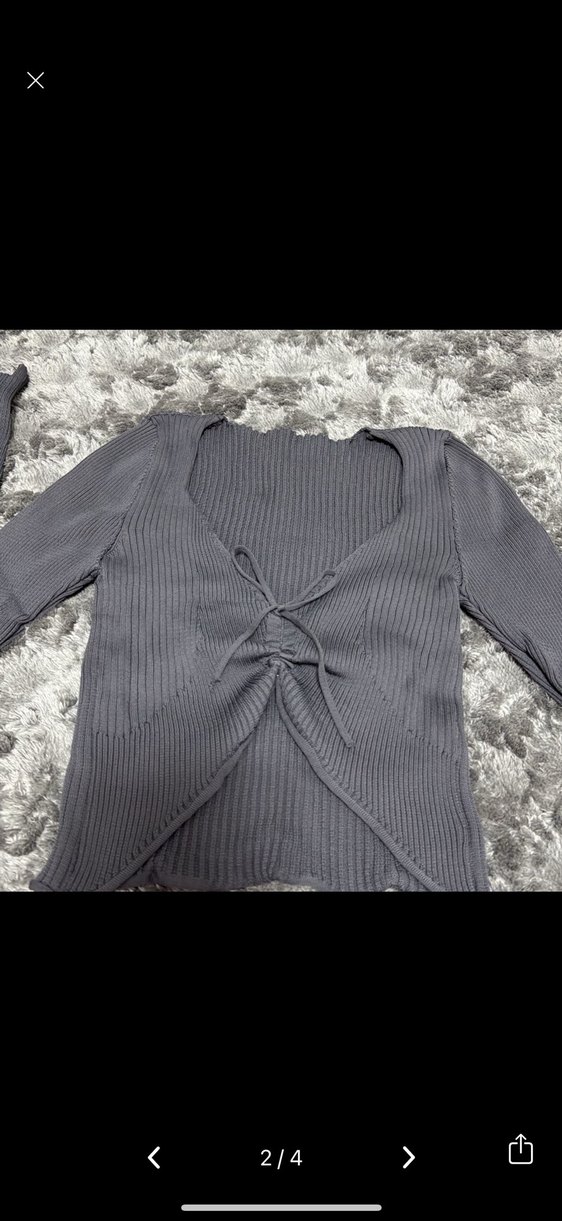 Gri renkli, uzun kollu, V yaka ve önünde bağcıklı detay bulunan triko kazak, rahat ve şık bir gündelik stil sunar.