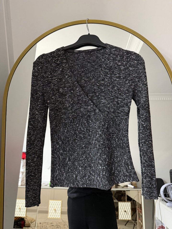 Kadınlar için uzun kollu, V yakalı ve vücuda oturan gri triko kazak. Yumuşak sentetik kumaştan örülmüş, normal midi boyundadır.